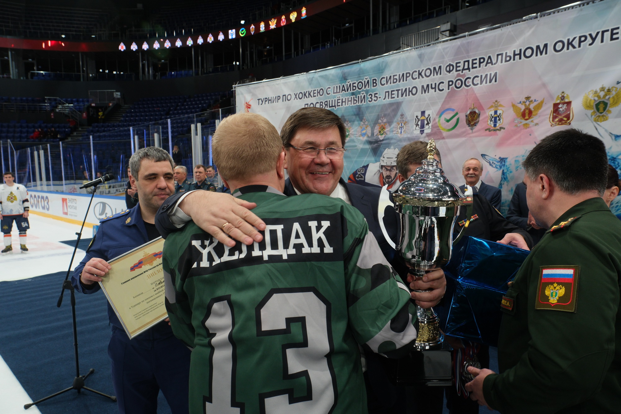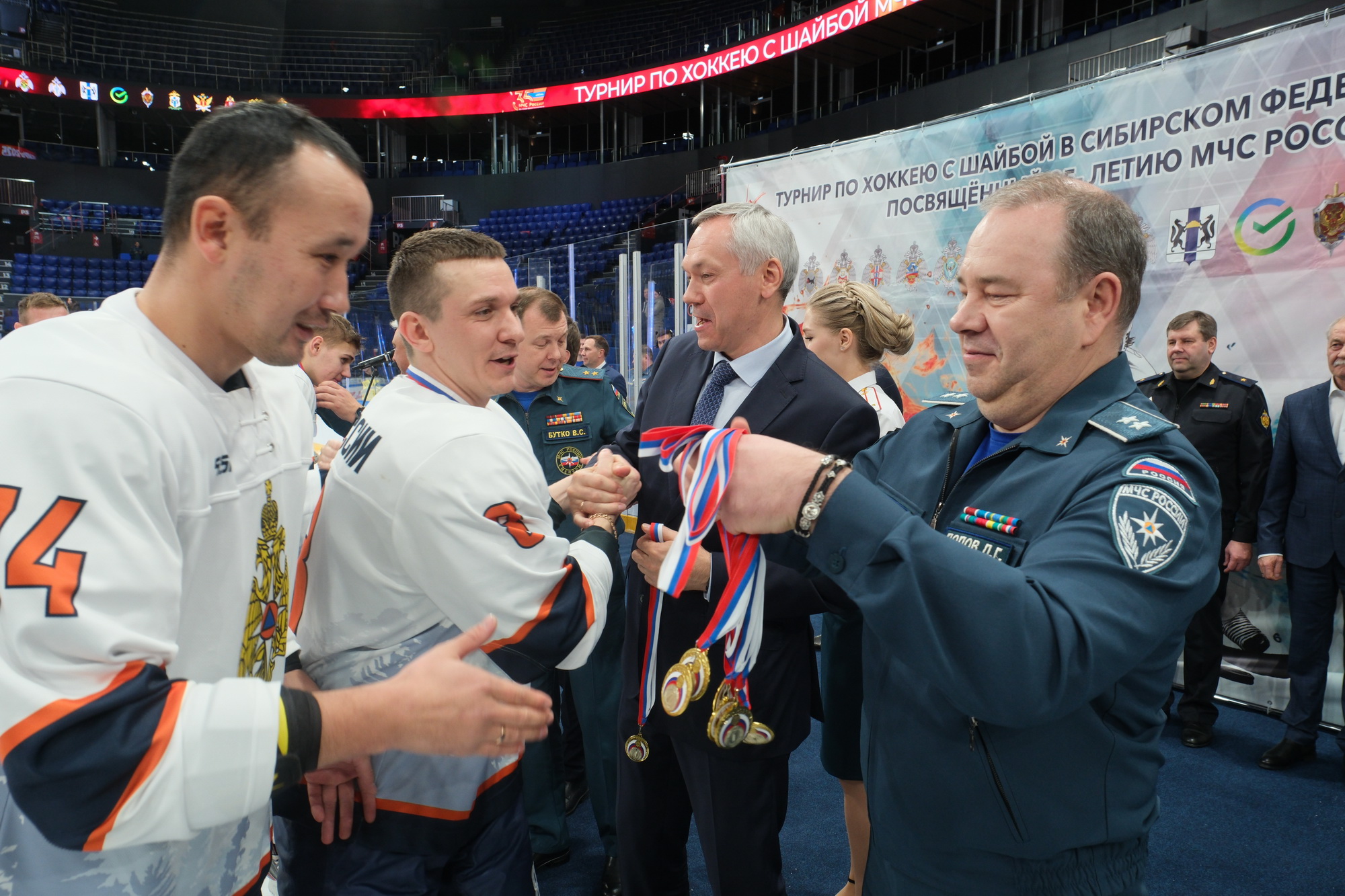 Губернатор Новосибирской области Андрей Травников, статс-секретарь – заместитель Министра МЧС России Денис Попов, заместитель Министра по делам гражданской обороны, чрезвычайным ситуациям и ликвидации последствий стихийных бедствий Вячеслав Бутко и начальник Главного управления МЧС России по Новосибирской области Виктор Орлов приняли участие в церемонии закрытия-награждения турнира по хоккею с шайбой на льду среди территориальных органов МЧС России Сибирского федерального округа, Правительства Новосибирской области и силовых ведомств Новосибирской области.