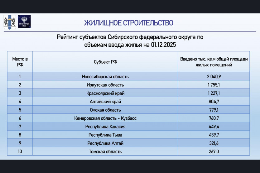 Кроме того, регион остаётся бессменным лидером на протяжении последних лет по объёмам вводимого в эксплуатацию жилья среди субъектов Сибирского федерального округа, опережая Иркутскую область почти на 300 тыс. кв. м за период январь-ноябрь 2025 года.